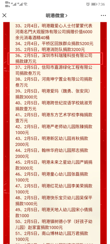 疫情無(wú)情,人有情,疫情期間,深圳市科瑞隆科技有限公司向信陽(yáng)市明港捐款4萬(wàn)元,助力家鄉(xiāng)防控疫情。